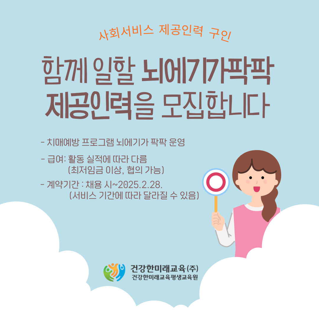 2024년도 뇌에기가팍팍 사업운영을 위해 함께 일할 유능한 인재를 아래와 같이 공개모집 합니다.