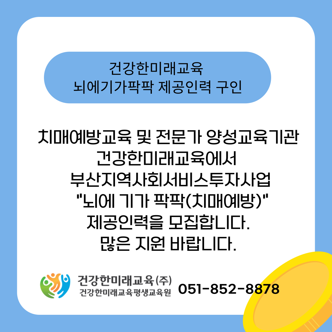 건강한미래교육에서 2023년도 뇌에기가팍팍 사업운영을 위해 함께 일할 인재를 아래와 같이 공개모집 합니다.